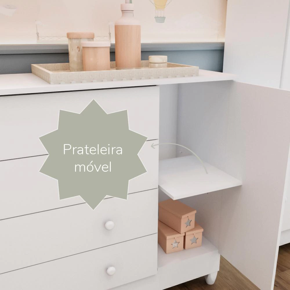 Duas peças que se combinam e atraem sempre os olhares onde ficam. O berço 3 em 1 que garante aquele sono gostoso e seguro do seu filho até depois que ele cresce e vai para sua caminha. A cômoda fraldário nunca te deixa na mão e oferece todo o espaço necessário para você trocar o seu baby. Estes produtos se encontram disponíveis nas cores Branco e Branco com Bétula.